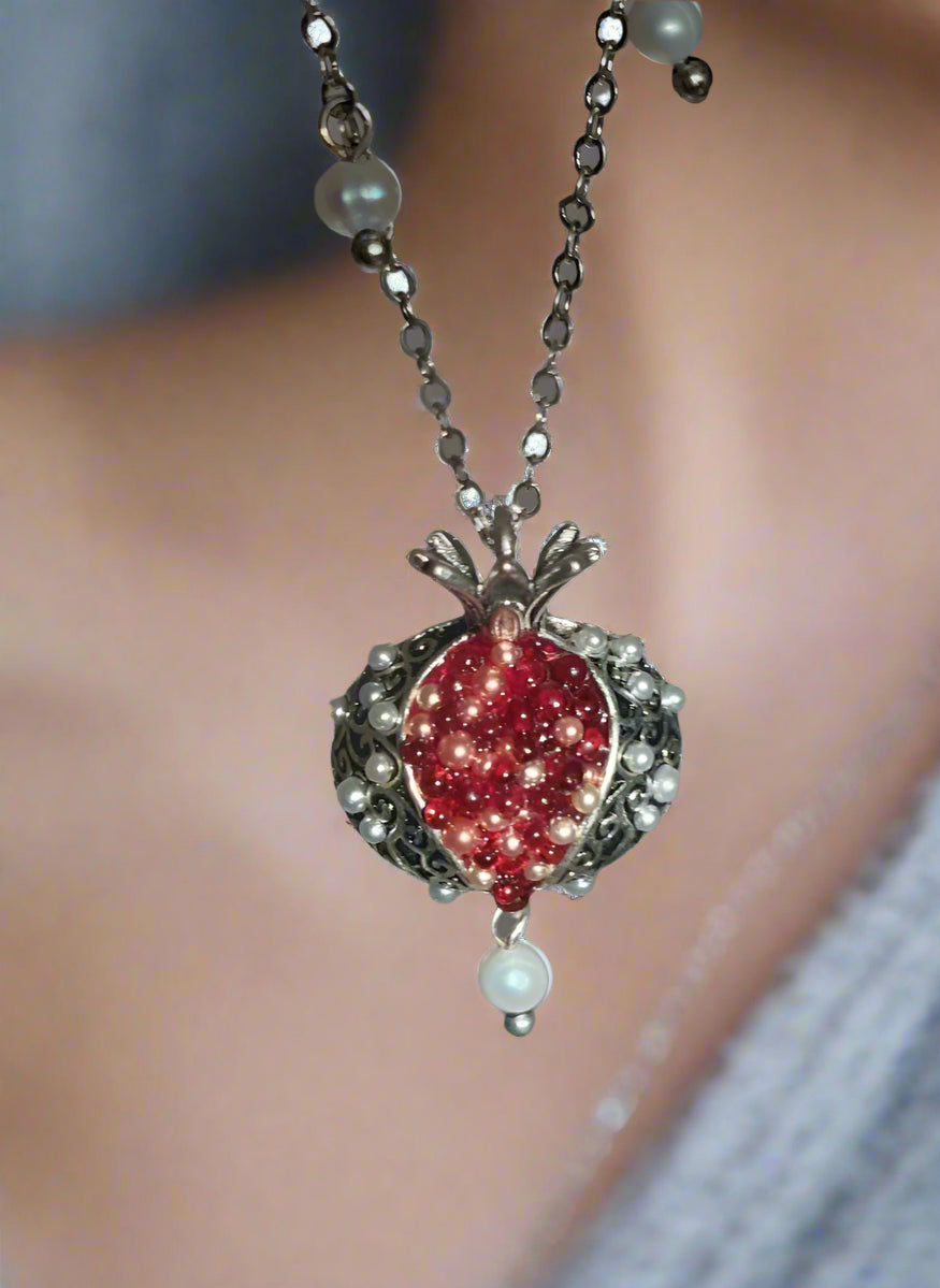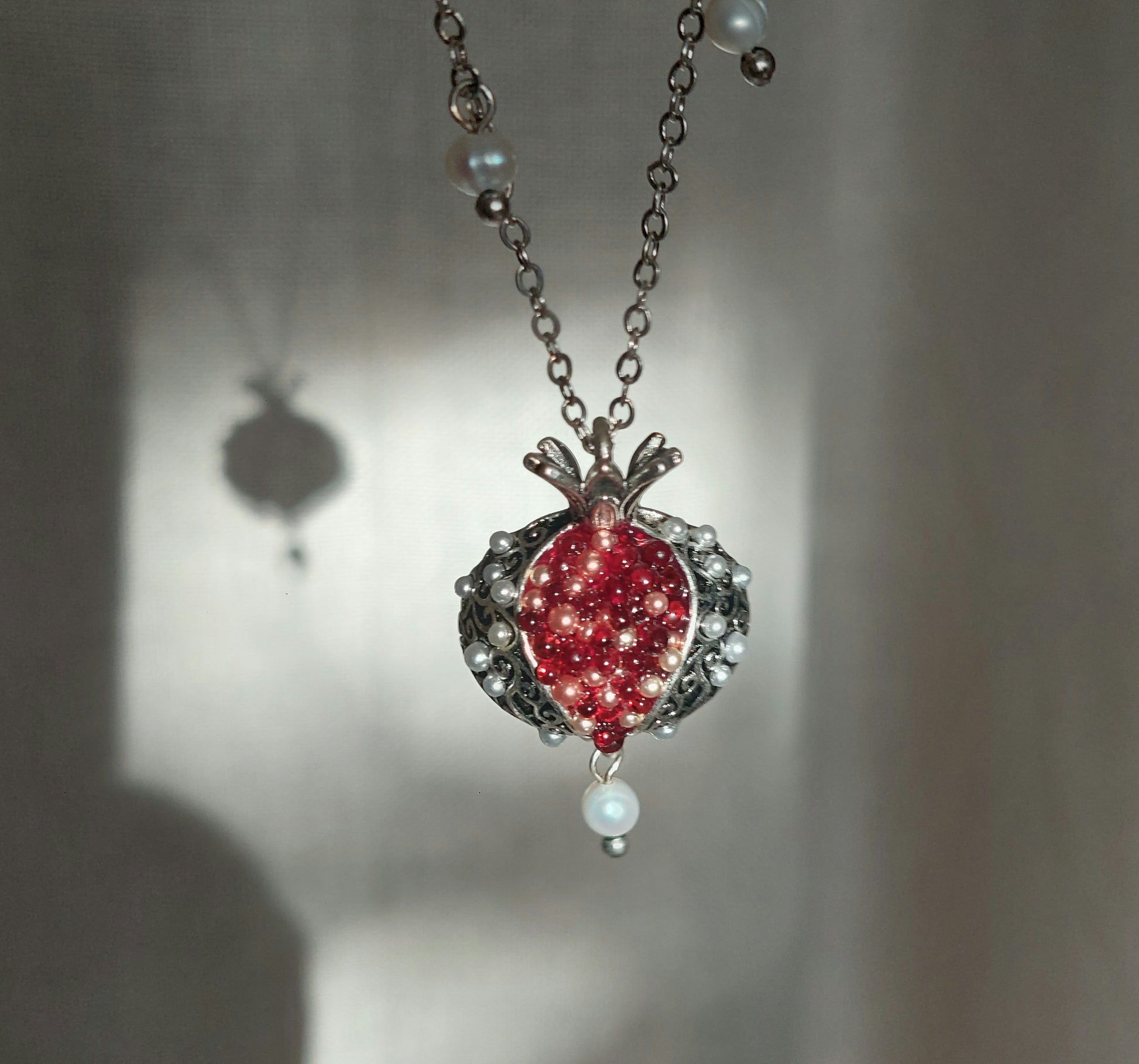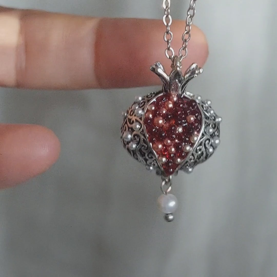 Elevate your jewelry collection with these exquisite pomegranate-themed necklaces, perfect for any occasion. Each piece features a detailed, intricately designed pomegranate pendant adorned with small, shimmering beads in rich red and copper tones, symbolizing abundance and prosperity.