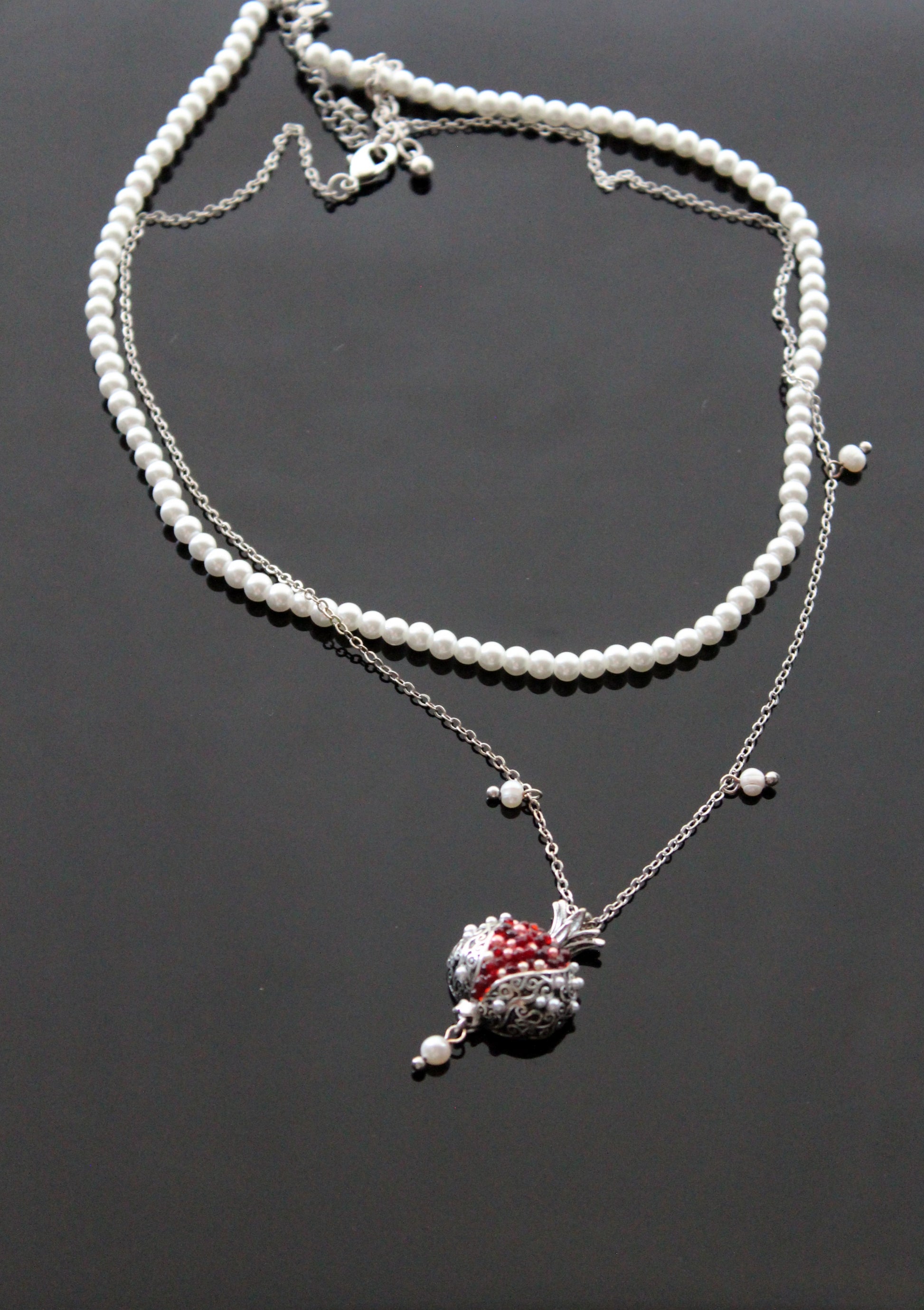 Description: This elegant choker combines classic glass pearls with the unique pomegranate pendant, creating a sophisticated and timeless look. The choker length is 14 inches, with an additional 2-inch adjustable extension for a perfect fit.