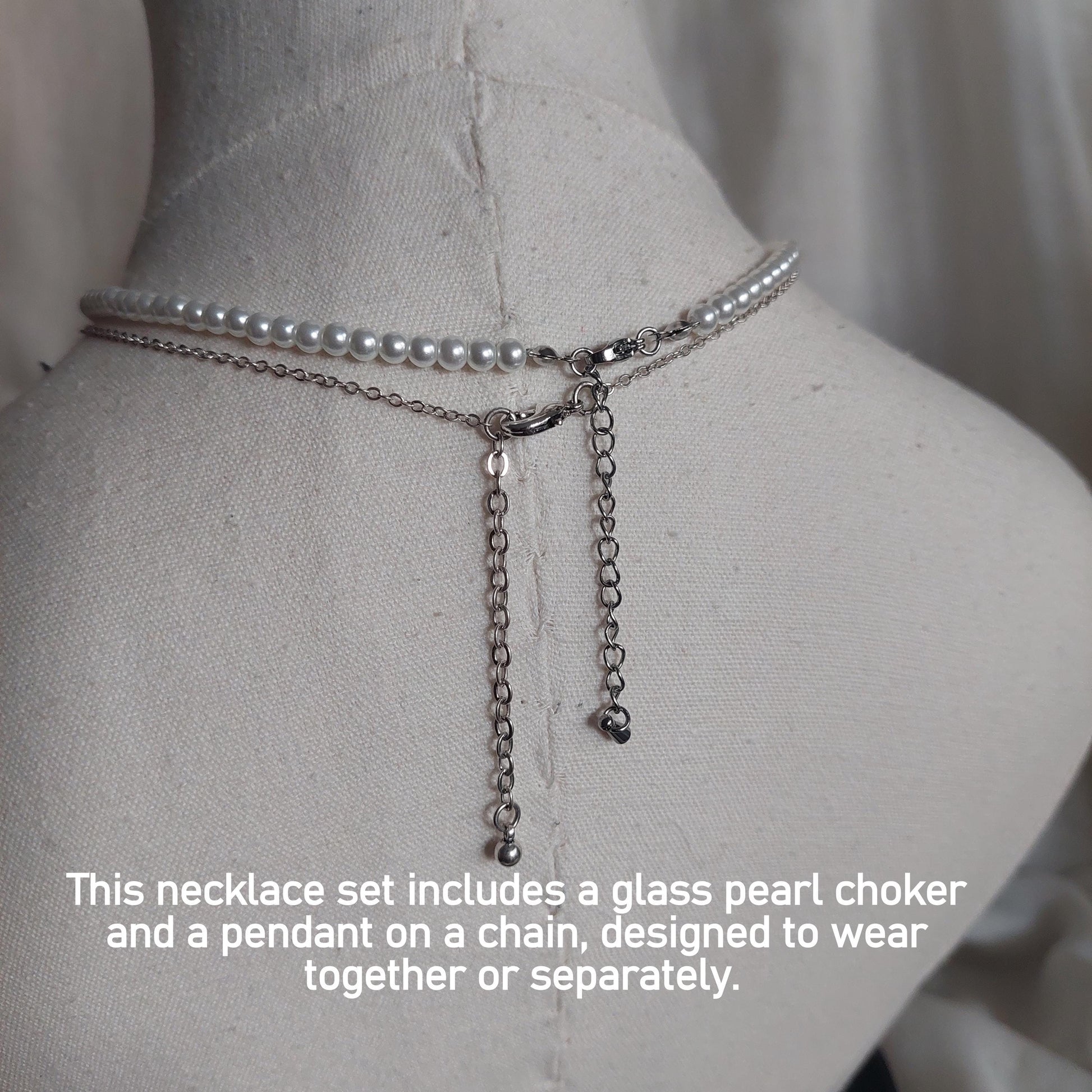 This necklace set includes a glass pearl choker and a pendant on a chain, designed to wear together or separately for effortless style.