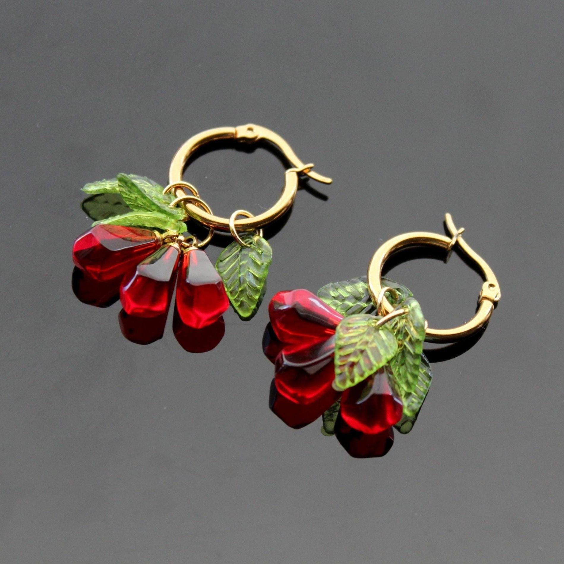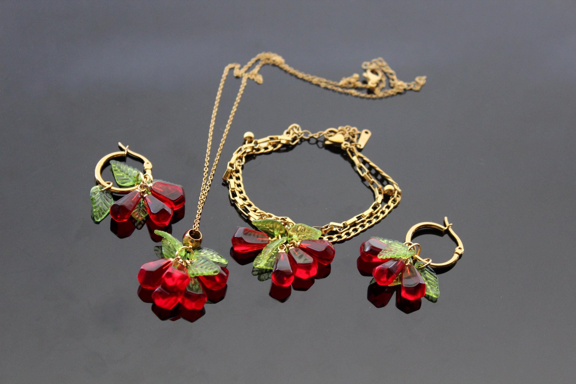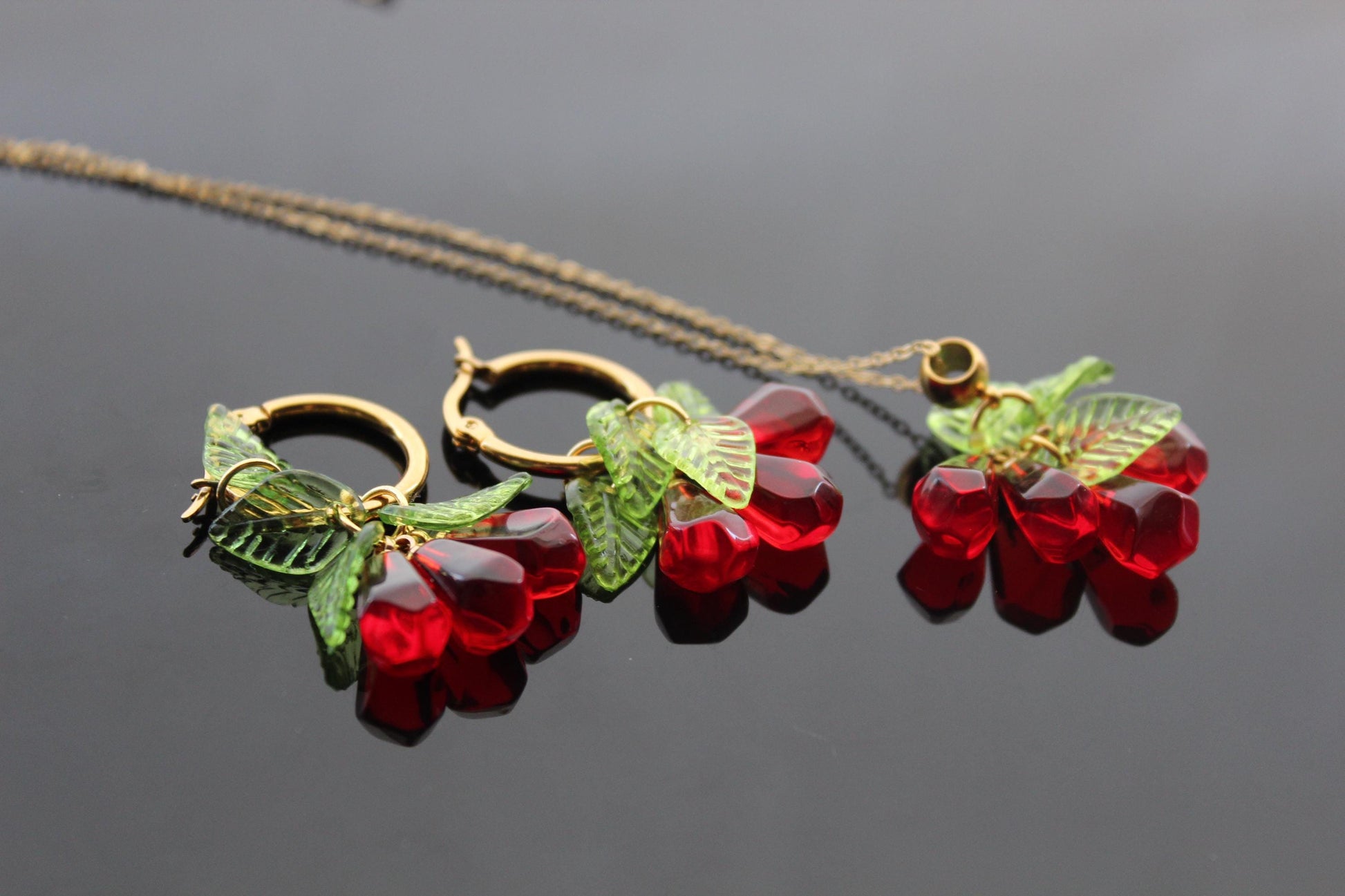 Pomegranate seeds hoop earrings and necklace gold plated stainless steel hypoallergenic jewelry