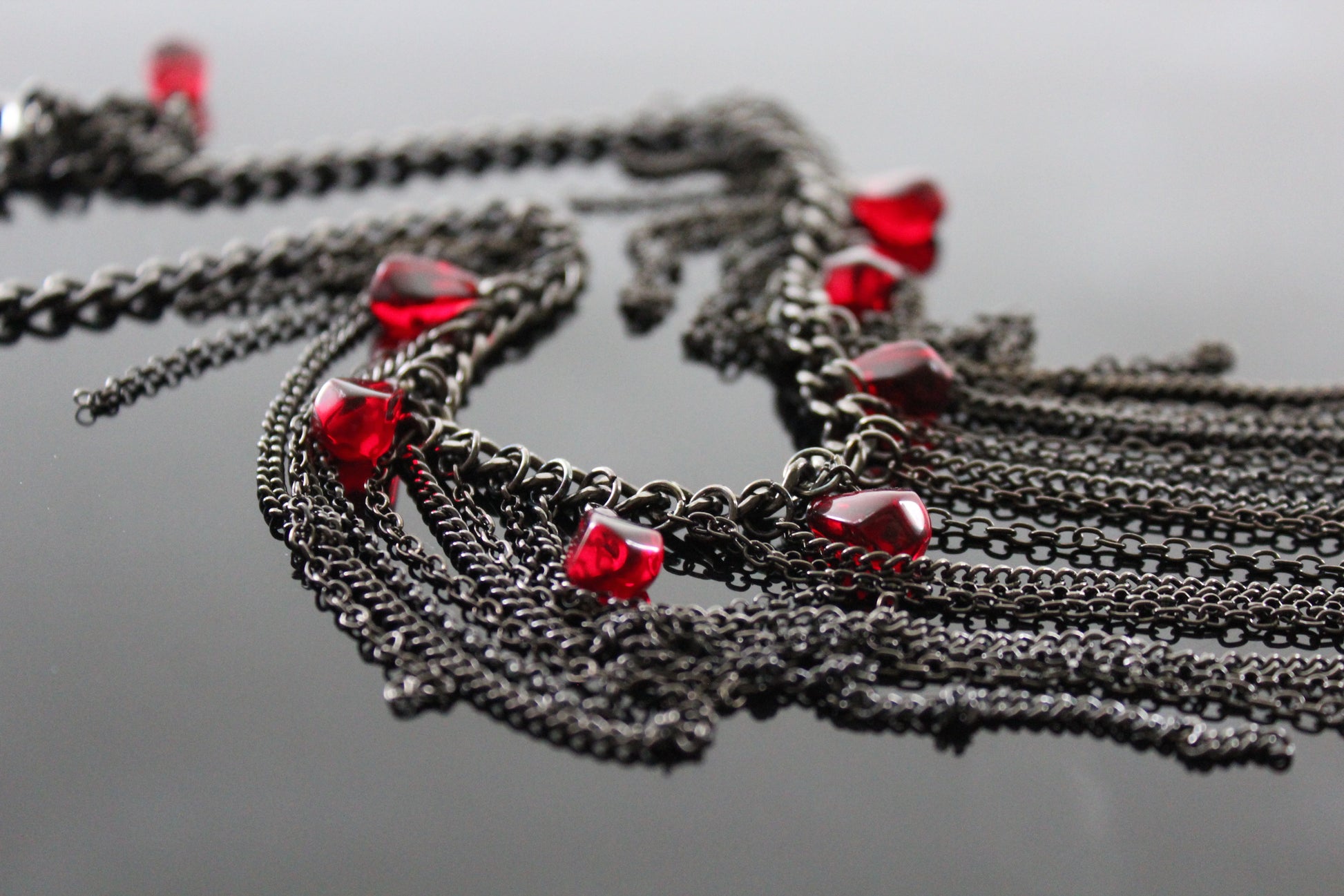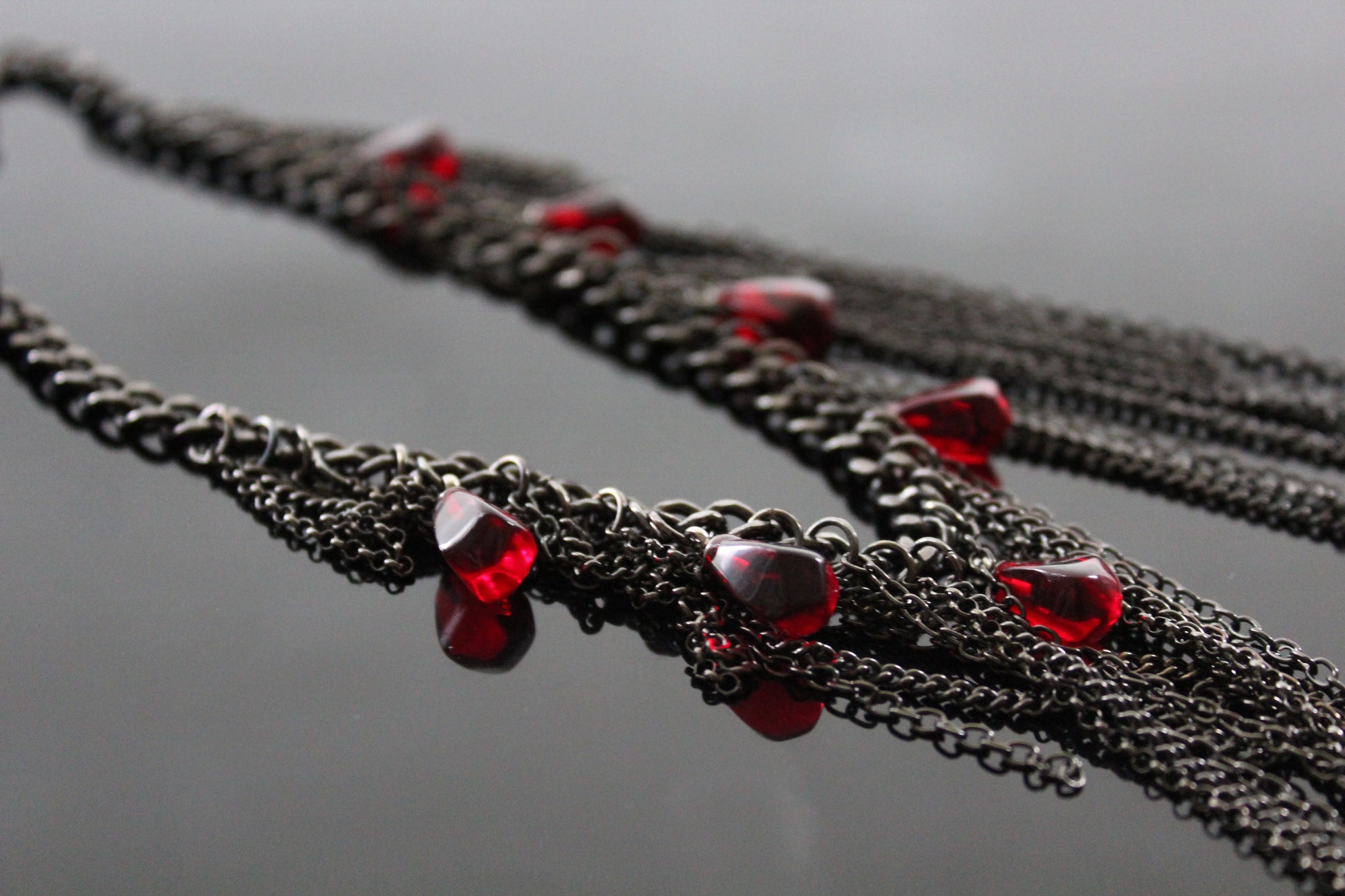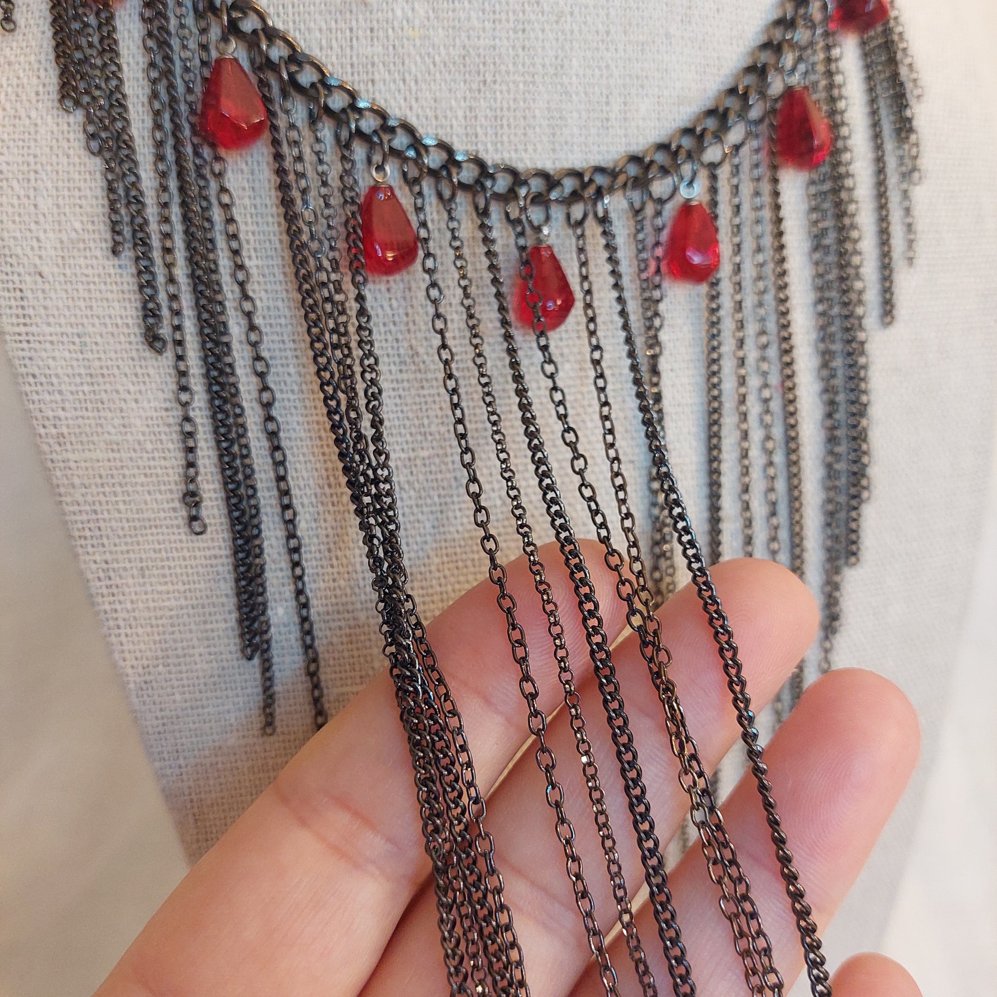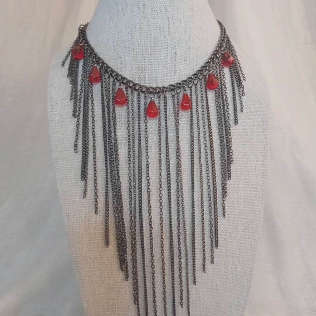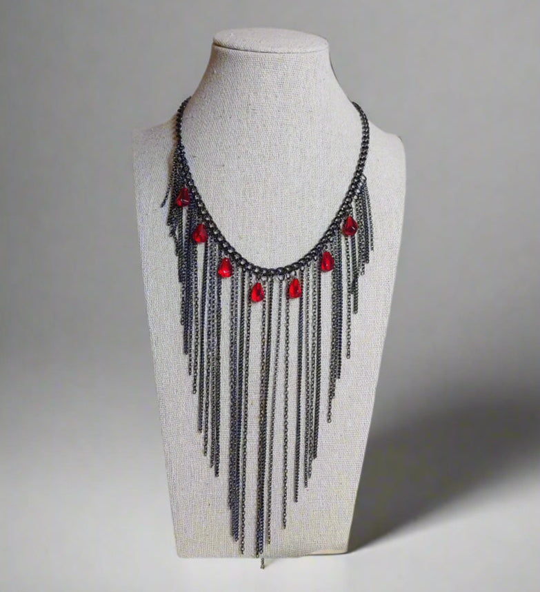 Add a touch of elegance to any outfit with our stunning Black Stainless Steel Rib Cascade Necklace. Crafted with black stainless steel and adorned with glass pomegranate beads, this necklace is sure to make a statement. Elevate your style and show off your unique fashion sense.